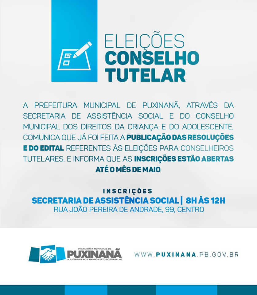 A Prefeitura Municipal de Puxinanã, através da Secretaria de Assistência Social e o CMDCA, comunica que já foi feita a publicação das resoluções e do edital referentes às eleições para Conselheiros Tutelares.