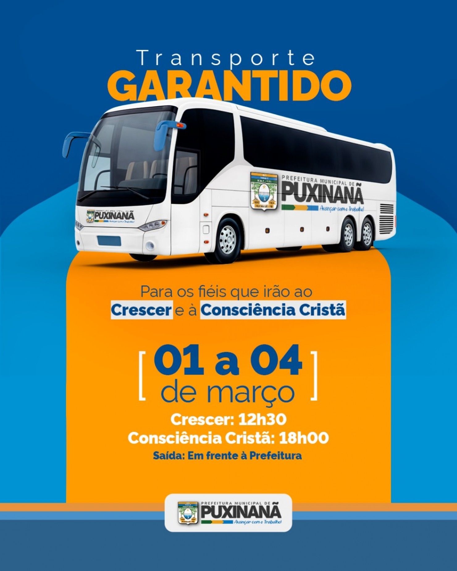 A Prefeitura de Puxinanã, por meio da Secretaria de Transporte, oferecerá ônibus gratuitos para os fiéis que desejam participar dos eventos religiosos do Carnaval em Campina Grande. A iniciativa visa proporcionar mais comodidade e segurança no deslocamento dos participantes.