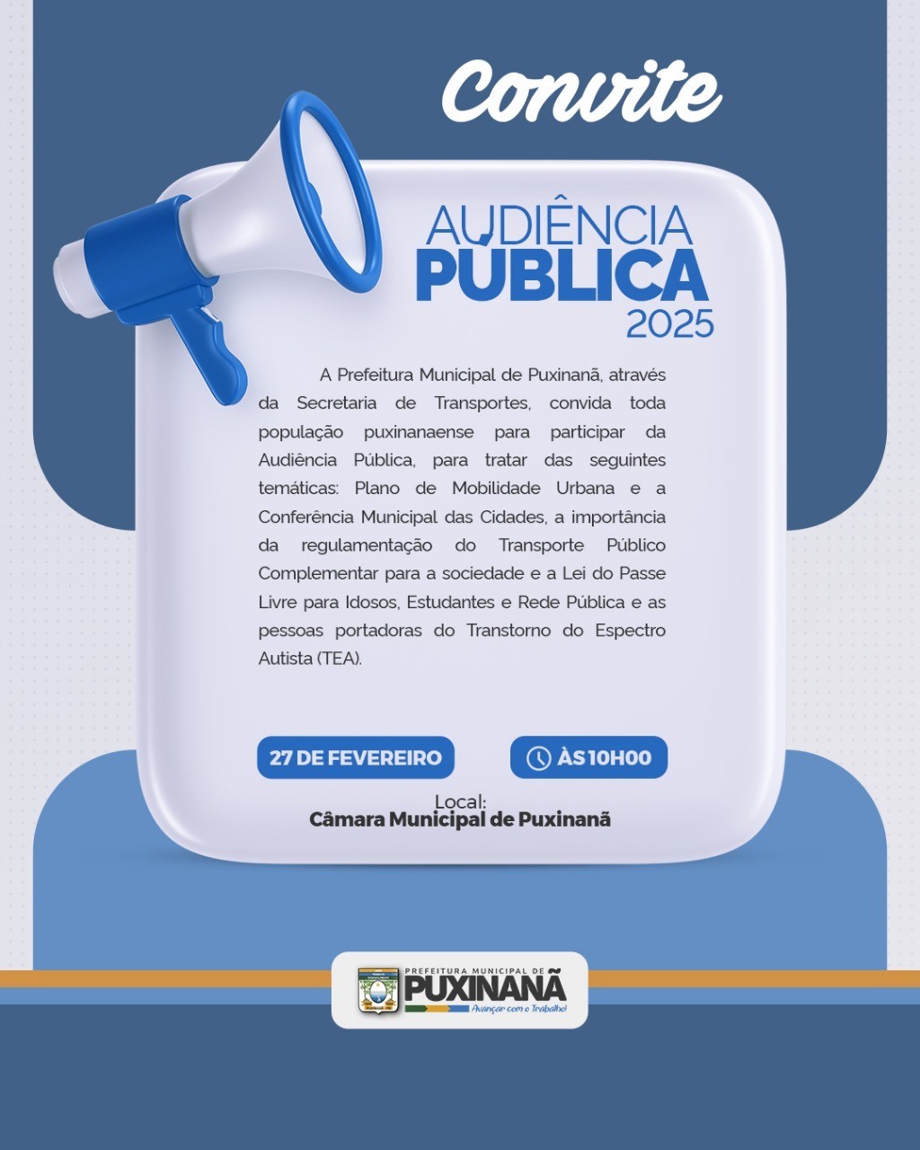 A Prefeitura de Puxinanã, por meio da Secretaria de Transportes, realizará uma Audiência Pública no dia 27 de fevereiro, às 10h, na Câmara Municipal. O evento será aberto a toda a população e abordará temas essenciais para o desenvolvimento do município.