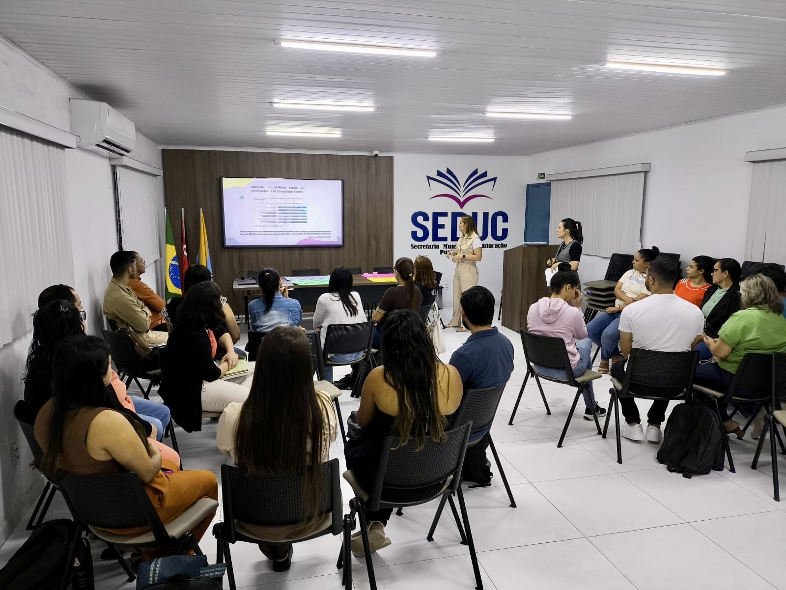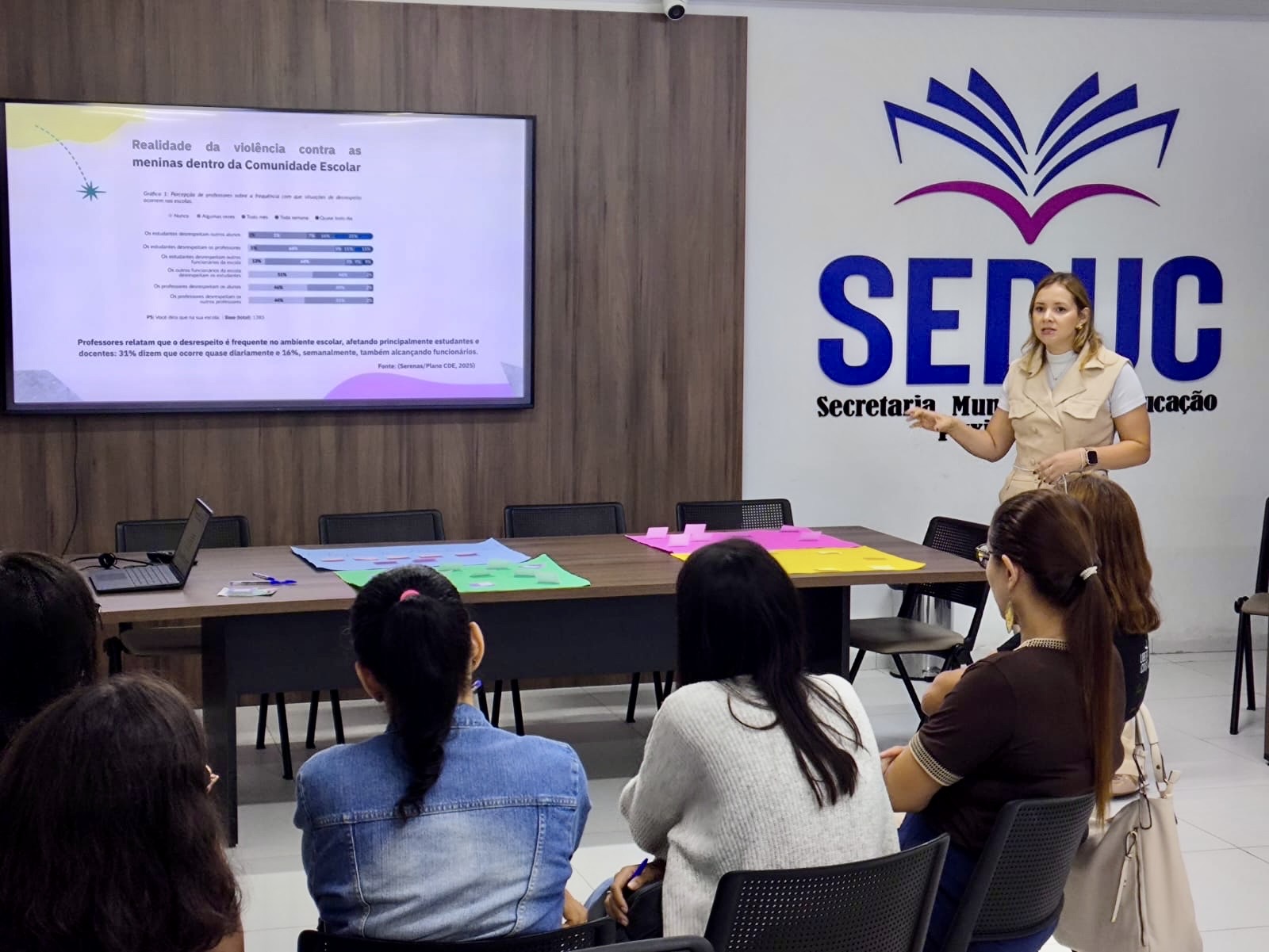O encontro contou com a presença da Procuradora-Geral do Município, Catarine Oliveira; da Secretária da Mulher, Elisangela Nascimento; da Secretária Adjunta da Mulher, Carla Felinto; e do Coordenador Pedagógico da rede, Claudielhi Araújo.
