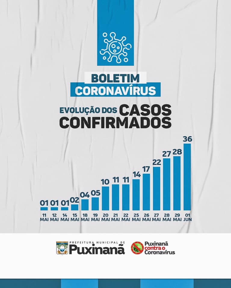 Atenção para a curva de crescimento dos casos confirmados de coronavírus em Puxinanã. Fique em casa! #ficaemcasapuxinanã #usemascara