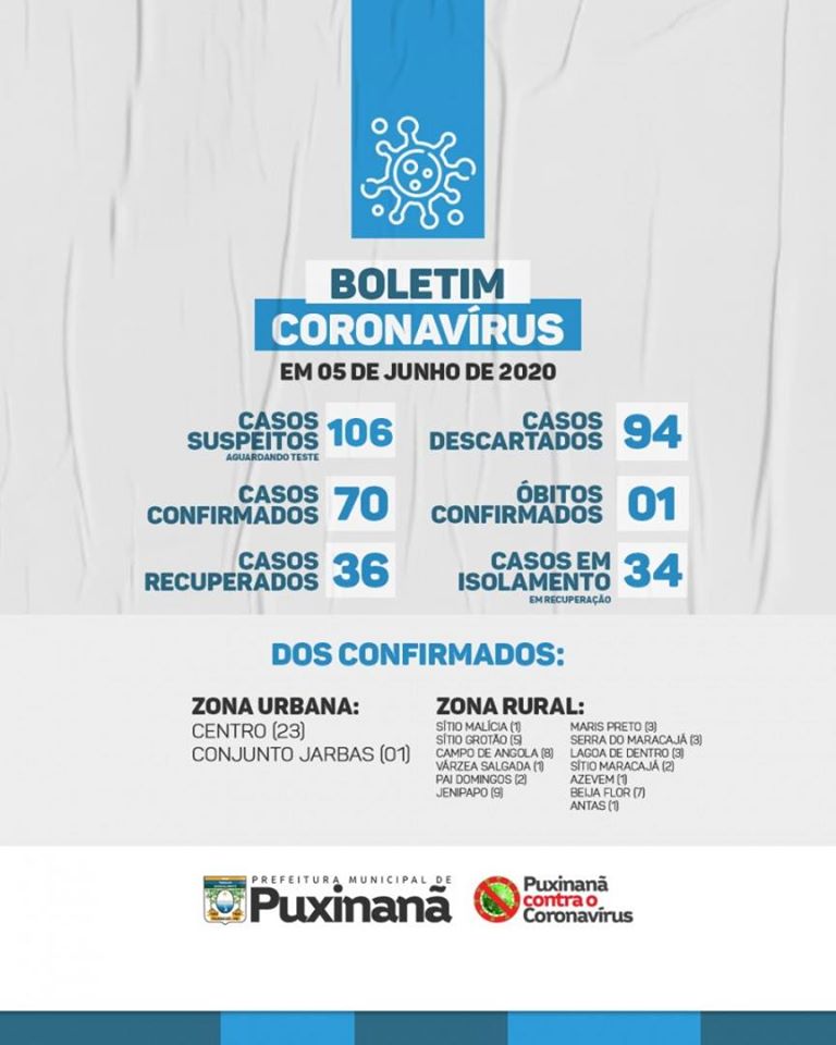 Do número total de casos confirmados, 36 já encontram-se recuperados, e 34 seguem em isolamento social aguardando o prazo de recuperação.