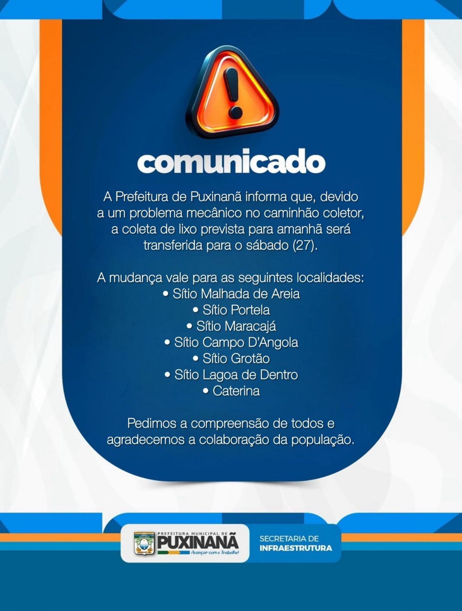 A Prefeitura Municipal de Puxinanã informa aos moradores da Zona Rural que, devido a problemas mecânicos imprevistos em um dos caminhões coletores, houve a necessidade de alteração na rota da coleta de lixo programada para esta data.
