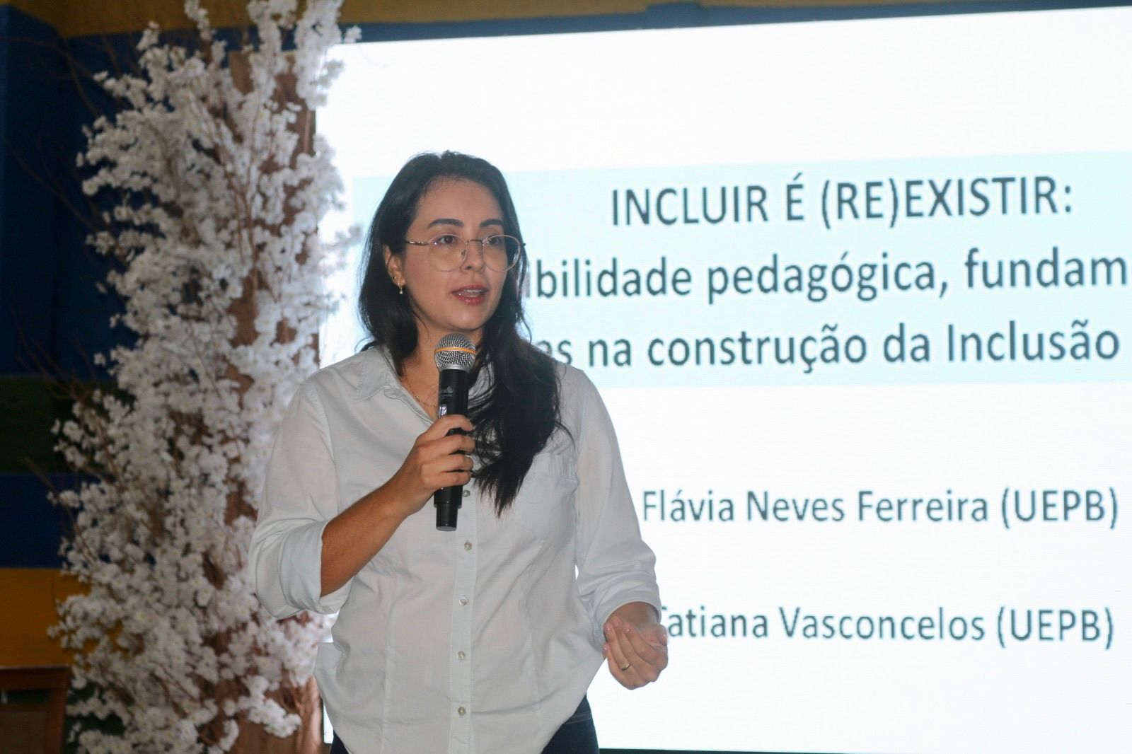 A programação do dia começou às 07h30 com a palestra "INCLUIR É (RE)EXISTIR: Acessibilidade Pedagógica, Fundamentos e Práticas na Construção da Inclusão Escolar com Sentido", ministrada pela Profa. Dra. Flávia Neves.
