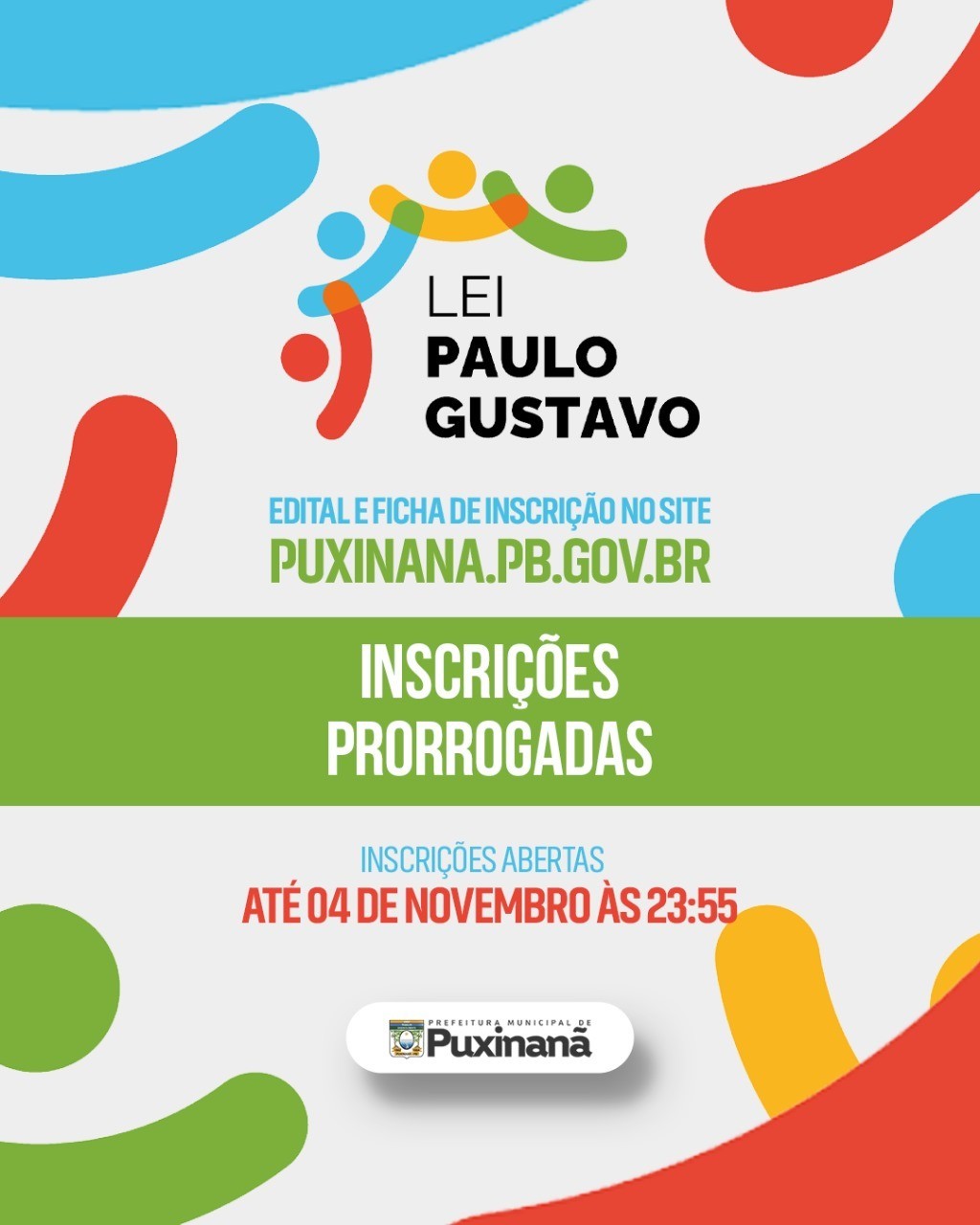 As Inscrições das fichas da Lei Paulo Gustavo foram prorrogadas até o dia 04 de Novembro de 2023 às 23:55 horas.