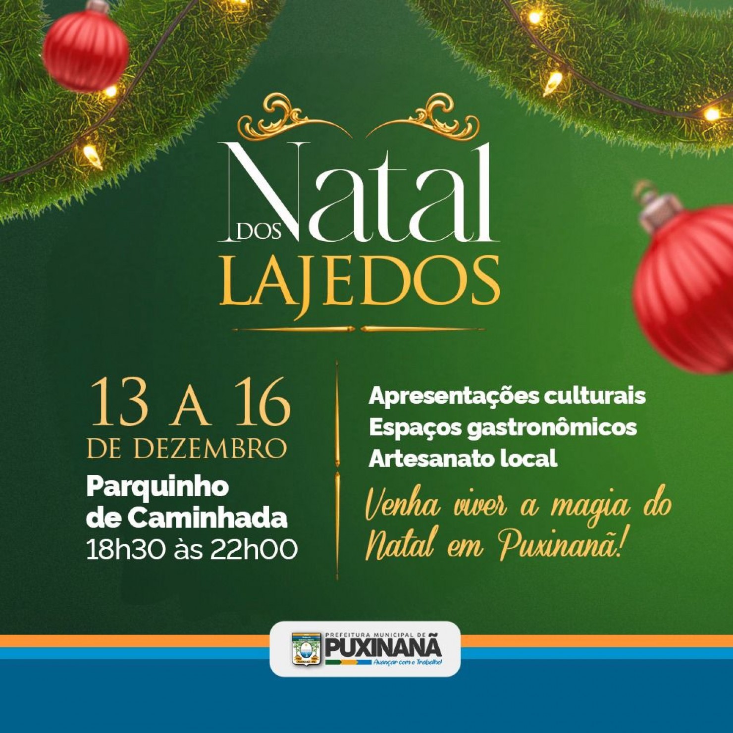 A Prefeitura de Puxinanã divulga a programação oficial do Natal dos Lajedos para os dias 13 a 16 de dezembro, no Parquinho de Caminhada, sempre das 18h30 às 22h. A iniciativa segue fortalecendo o clima natalino no município, reunindo famílias, valorizando talentos locais e proporcionando momentos especiais para toda a população.