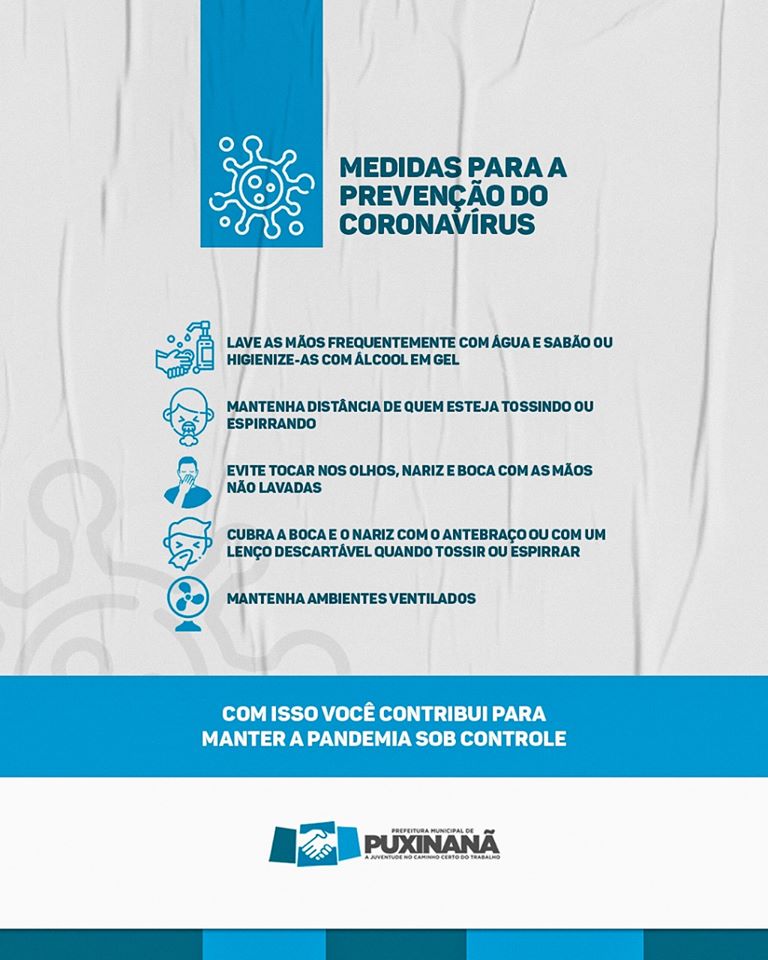 Mediante a Pandemia do Corona vírus, a Prefeitura de Puxinanã, através da Secretaria de Saúde do Município, tem Orientado a população puxinanaense sobre a prevenção contra o vírus, onde acredita que tomando ás devidas orientações necessárias, evitaremos que o mesmo se espalhe.