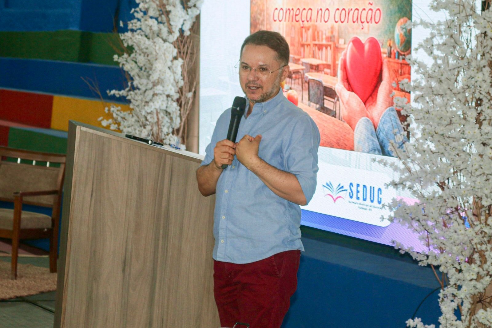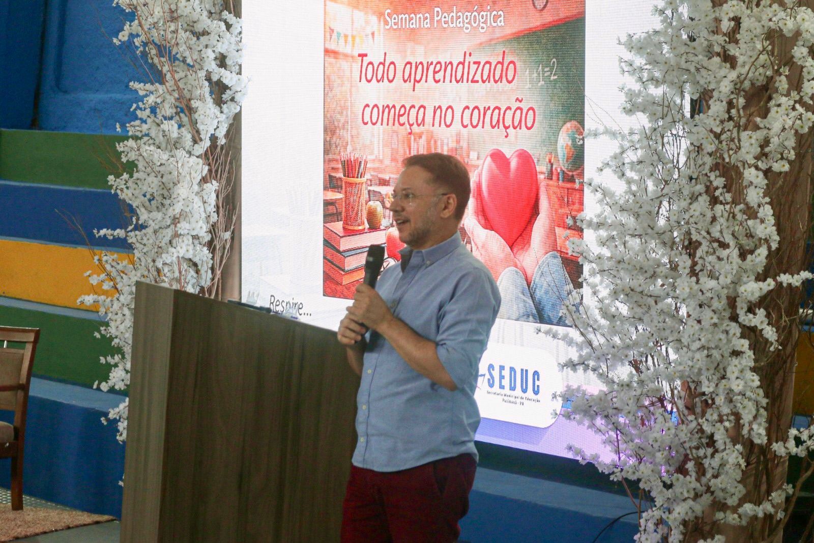 Em sua explanação, o especialista provocou reflexões sobre o papel do educador na construção de um ambiente escolar que faça sentido para o aluno e discutiu como as práticas pedagógicas impactam o futuro da comunidade.
