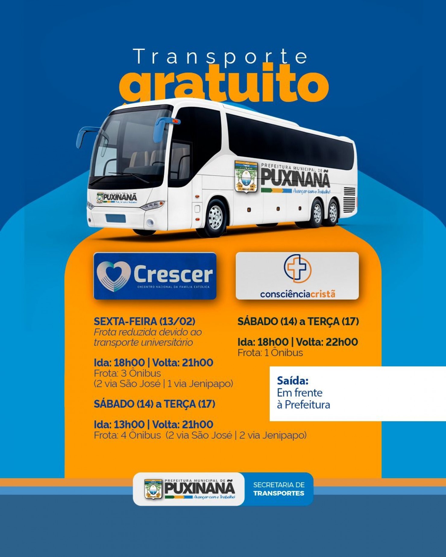 A Prefeitura Municipal de Puxinanã, por meio da Secretaria de Transportes, informa à população que disponibilizará transporte gratuito para os eventos religiosos Crescer e Consciência Cristã. As saídas ocorrerão sempre em frente à Prefeitura.