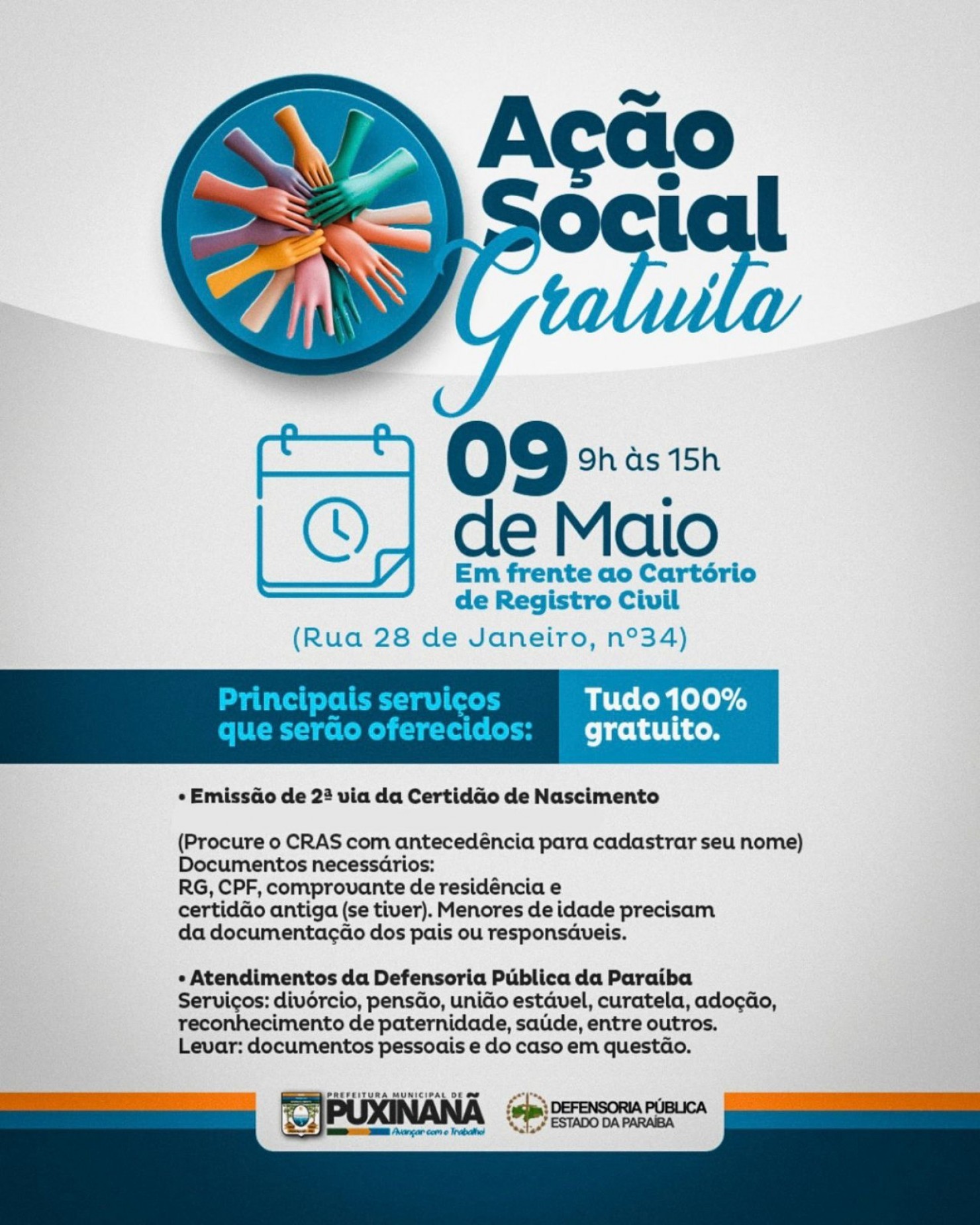 Esta é mais uma ação promovida pela Prefeitura Municipal de Puxinanã em parceria com a Defensoria Pública. Durante a ação social, as pessoas terão acesso aos seguintes serviços:
