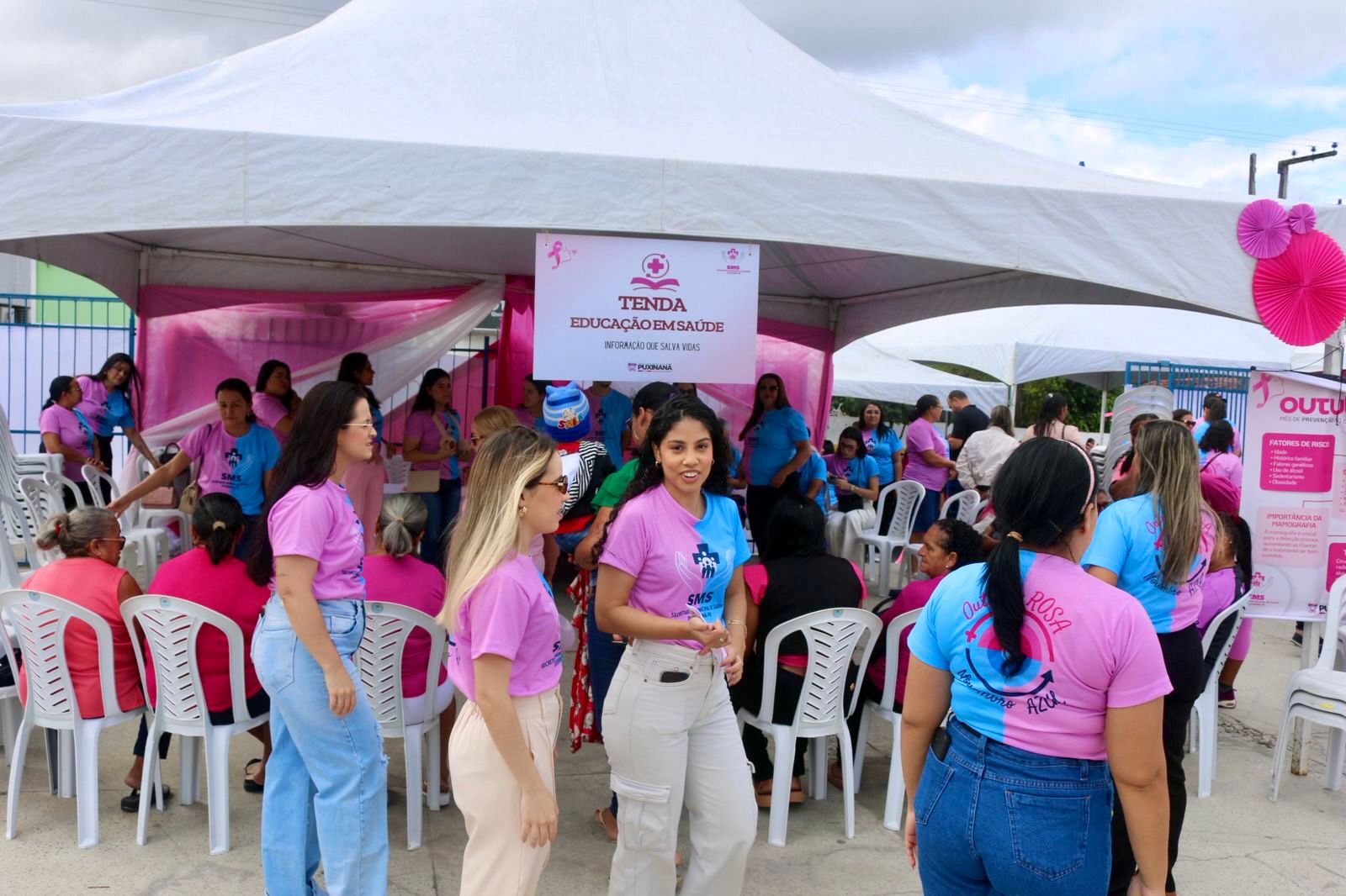 Nesta quinta-feira (23), o Parque de Eventos de Puxinanã recebeu o Dia D do Outubro Rosa, uma ampla ação de saúde e bem-estar promovida pela Prefeitura de Puxinanã, por meio das Secretarias de Saúde e da Mulher. O evento teve como objetivo reforçar a importância da prevenção e do diagnóstico precoce do câncer de mama e do colo do útero, além de incentivar o autocuidado entre as mulheres do município.