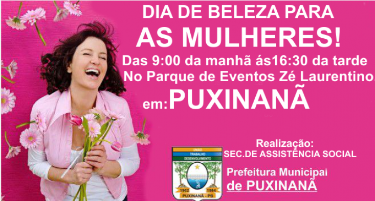 NESTE DIA 10/03 Á PARTIR DÁS 9:00 HS DA MANHÃ, A PREFEITURA MUNICIPAL DE PUXINANÃ, JUNTO DA SECRETARIA DE ASSISTÊNCIA SOCIAL, ESTARÁ REALIZANDO: UM DIA DE BELEZA PARA TODAS ÁS MULHERES PUXINANÃENSES, COM DIREITO A VÁRIOS TRATAMENTOS DE BELEZA, E DISPONIBILIZANDO ÔNIBUS PARA A ZONA RURAL, A PARTIR DÁS 8:00 HS DA MANHÃ, 12:00 HS, E RETORNO ÁS 17:00 HS,TODAS ESTÃO CONVIDADAS!