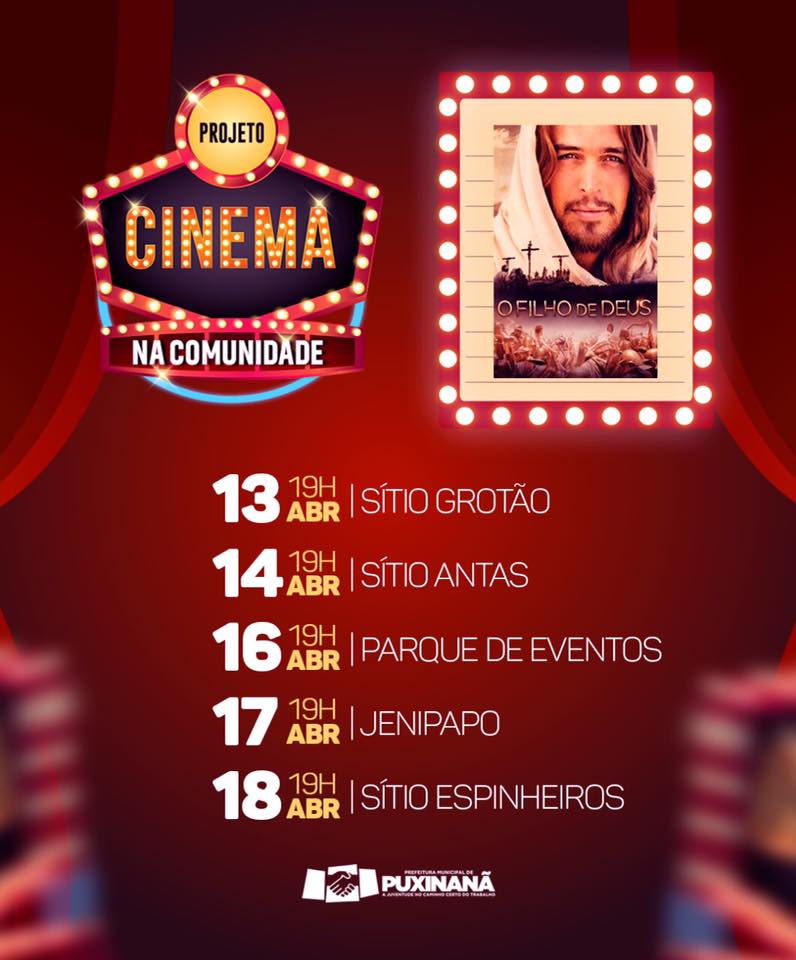 A Prefeitura Municipal de Puxinanã através da Secretaria de Cultura, está realizando em diversos setores do município, o projeto CINEMA NA COMUNIDADE. alusivo a semana santa, o projeto exibe durante os dias 13 á 18 de abril um filme conscientizador retratando a vida de Jesus.