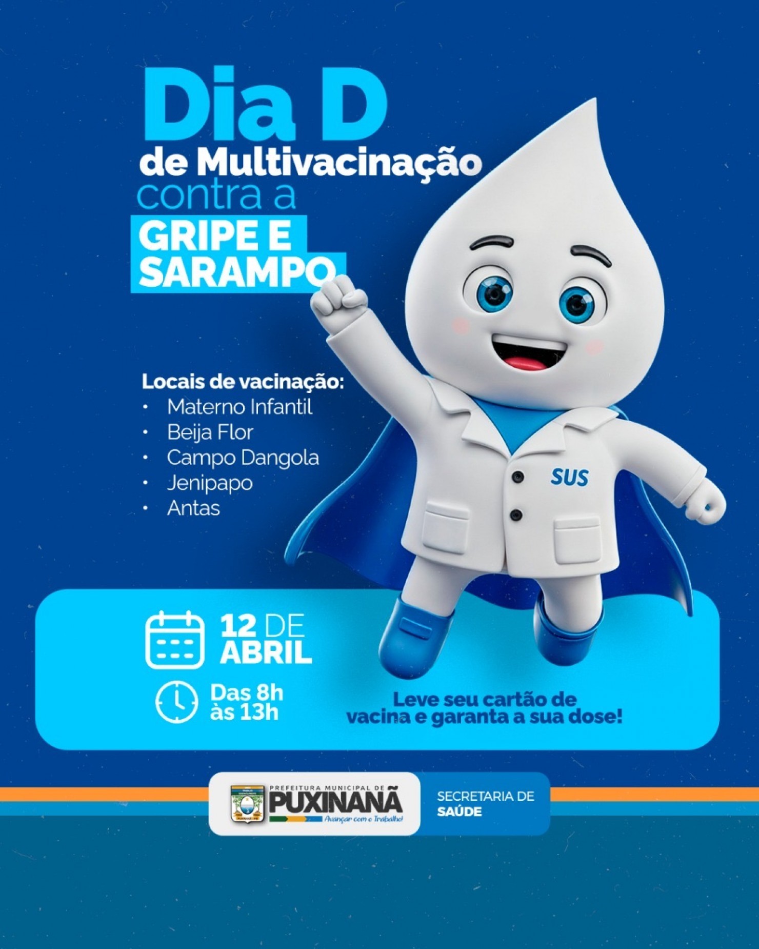 A Prefeitura de Puxinanã, por meio da Secretaria Municipal de Saúde, realiza neste sábado, 12 de abril, o Dia D de Multivacinação contra a gripe e o sarampo. A mobilização acontecerá das 8h às 13h, em cinco locais diferentes: Materno Infantil, Beija Flor, Campo Dangola, Jenipapo e Antas.